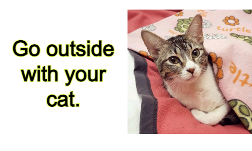 a friend suggested to go outside with the cat. john said when I open the outside door for his cat he said that the cat was so happy she is jumping and doing crazy thing lol. So if you have a cat you should go out side with your cat.